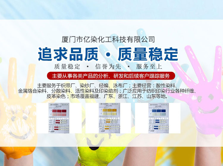 廈門市億染化工科技有限公司是一家集研發(fā)、生產、銷售一體的綜合型企業(yè)。公司主要經營:酸性染料、金屬絡合染料、高牢度分散染料及印染助劑。公司信守“以誠信贏合作、以質量贏市場、以創(chuàng)新贏發(fā)展、以服務贏生存”的企業(yè)精神服務于廣大客戶,多年以來建立了良好的市場口碑,市場遍布福建、廣東、浙江、江蘇、山東及東南亞國家,與多家知名企業(yè)建立了長期合作伙伴關系!